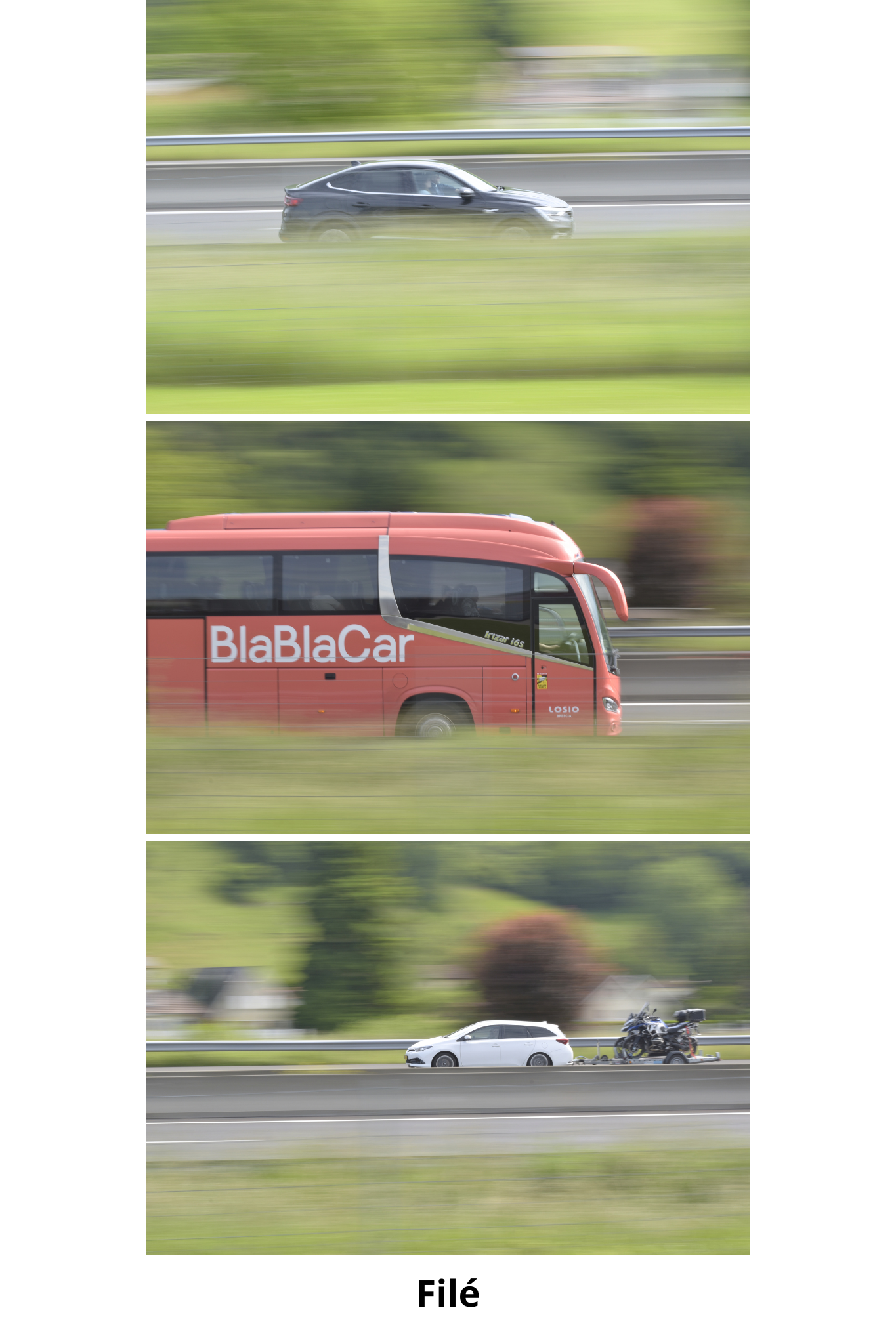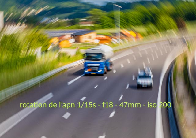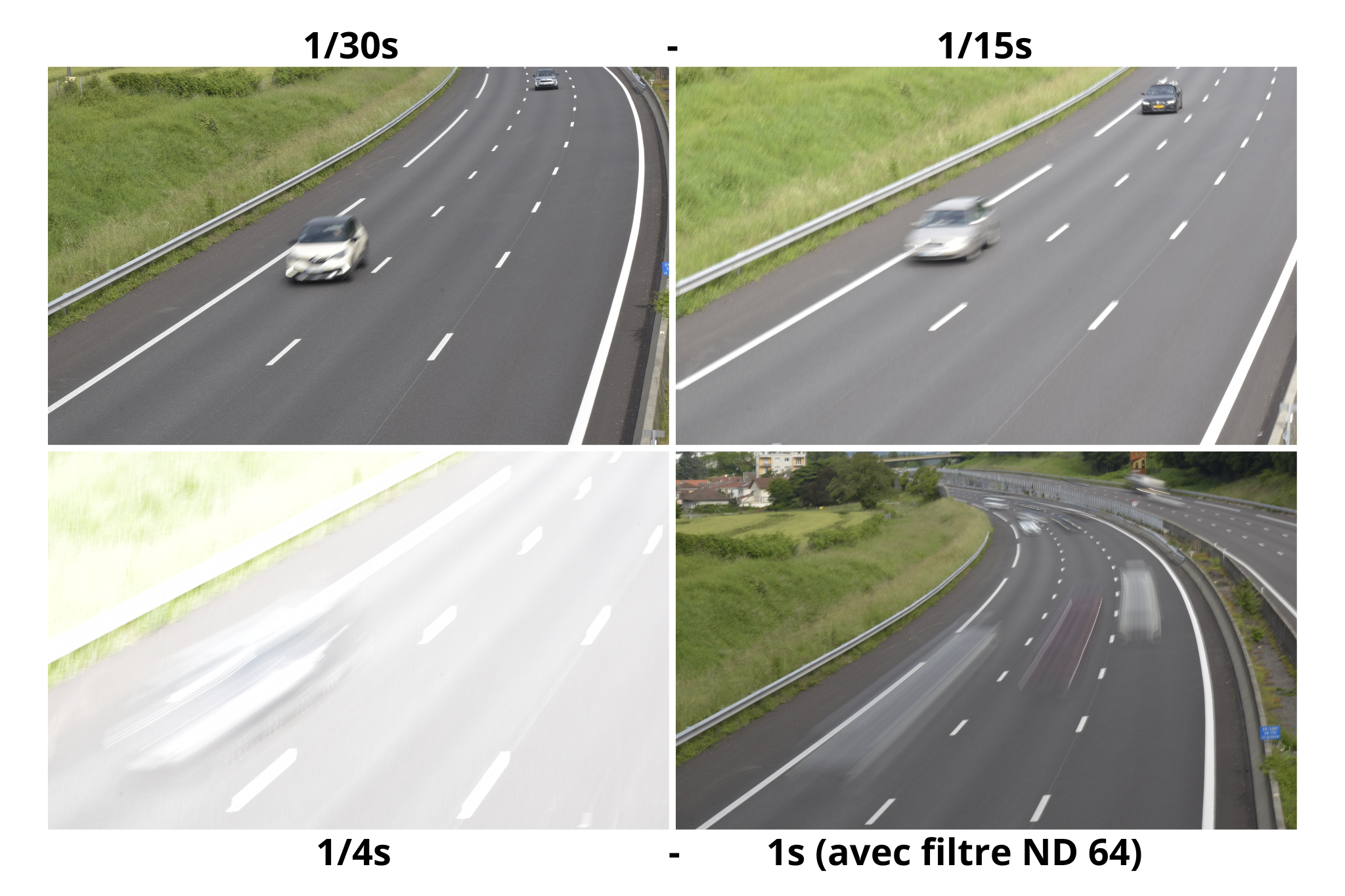 La vitesse d’obturation va dépendre de la vitesse de la voiture et de la focale utilisée. Donc, à chacun de tester suivant son matériel et le sujet photographié. Pour indication, ici, avec mon 70mm (capteur APSC) et des voitures entre 110 et 130km/h, j’étais à 1/20s. ou 1/25s. suivant les photos.