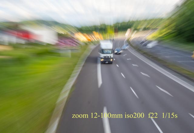 Toute la difficulté est de gérer la vitesse de notre « mouvement » (zooming, rotation…) par rapport à la vitesse de prise de vue. Ici, ma vitesse est réglée entre 1/5s. et 1/10s. suivant les photos.